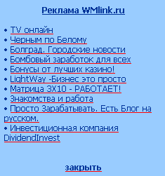 Раздел "Реклама WMlink" - всплывающий блок нашего сайта, отображаемый на всех страницах нашего сайта! Как помочь нам? Всё просто! Кликаете ссылки и помогаете проекту! Прокликали? - Нажимаете "Закрыть" и окно уйдет восвояси! Спасибо за то, что помогаете нам!